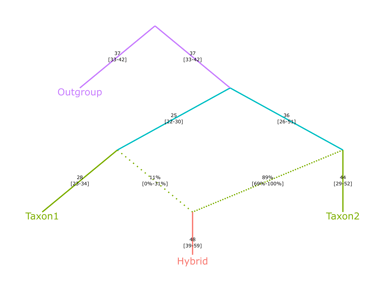If we want to introduce an admixture event, we have to add an admixture node and two extra internal nodes as end nodes cannot connect to more than one node. We start by replacing the end nodes with internal nodes and connect those nodes to each taxa and a shared admixture node: