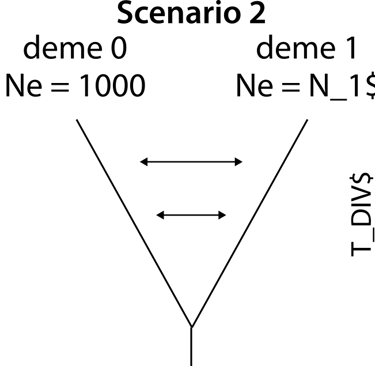 Thus, we use fastsimcoal2 to specify the following model, allowing the software to iteratively estimate our two unknown parameters, with this template (.tpl) file: