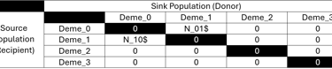 After this, we can continue with defining our first migration matrices. This must equally be done with great care to only model migration between existing demes and not to itself. The migration matrix in fastsimcoal2 are Nij matrices with i and j being the number of demes. Like all events and dynamics in fastsimcoal2, migration matrices are specified backwards in time. So the recipient population receives migrants if you reverse the natural flow of time to how it is modeled. In chronological order, the recipient population is therefore the source and the donor population the sink of migrants. While this notation may confuse you at first, it is necessary to consider both perspectives. fastsimcoal2 defines the migration as the likelihood of genes from the source population ending up in the sink. By reversing time, it quantifies how many migrants of the recipient population’s Ne migrated per generation.